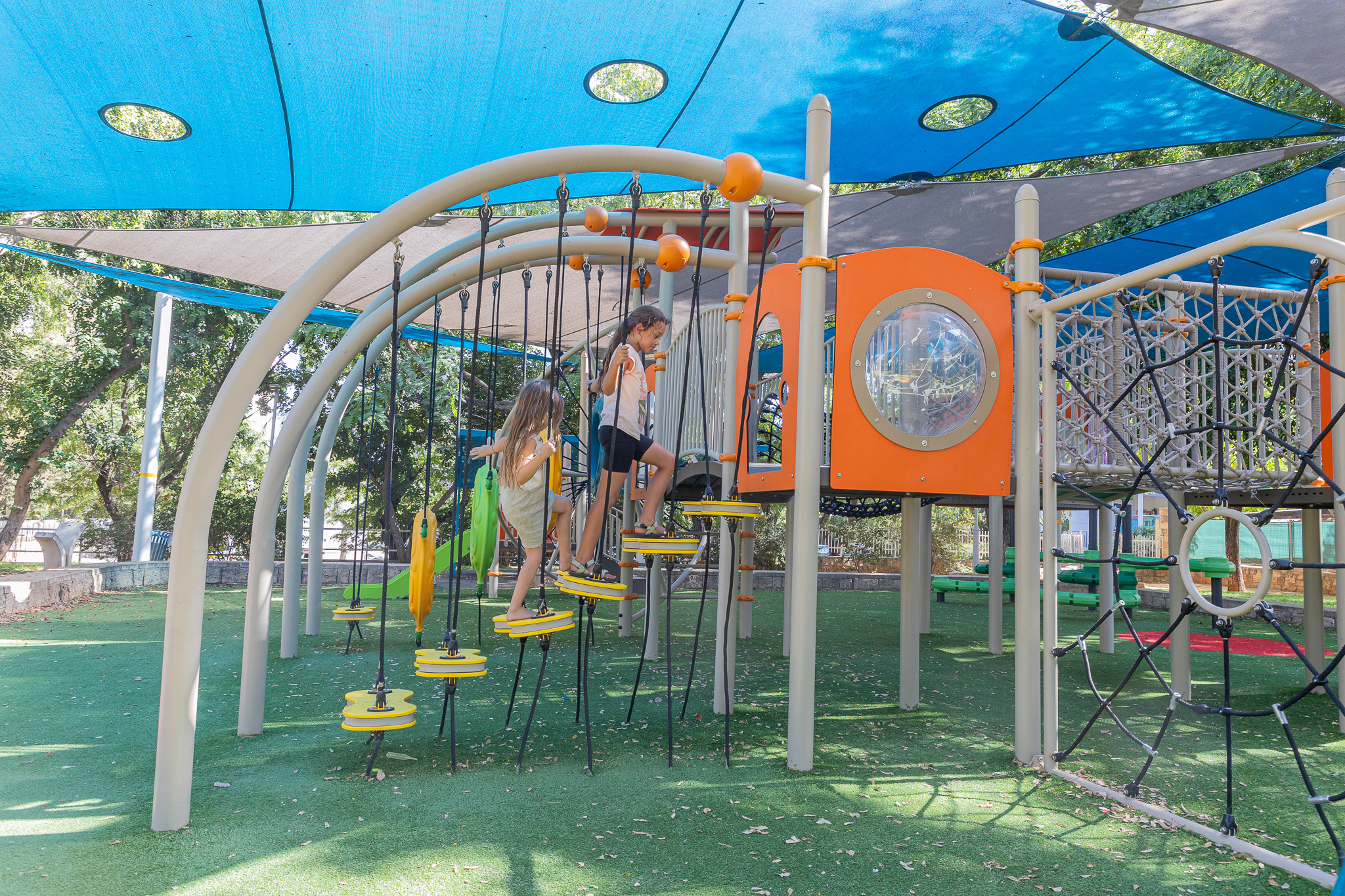 לבסוף, יש לקחת בחשבון את תנאי מזג האוויר. באקלים חם, ציוד מתכת ופלסטיק יכול להתחמם מאוד ולגרום לכוויות. וידוא שמגרשי המשחקים כוללים אזורים מוצלים או שימוש בחומרים שאינם שומרים חום יכולים למתן סיכון זה.