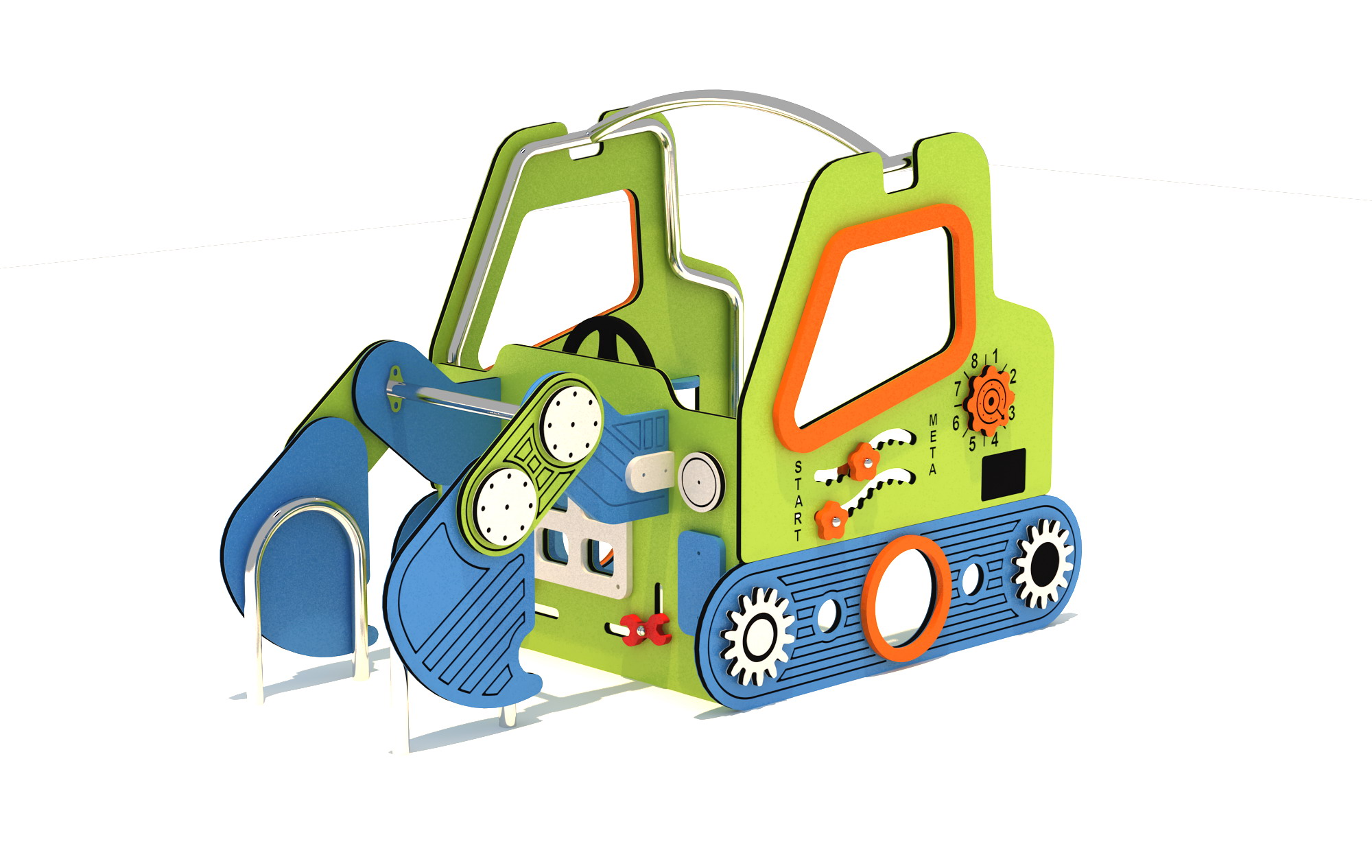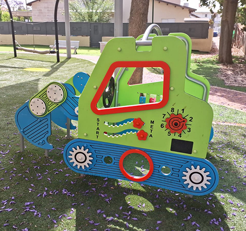 מתקן משחק דמוי כלי תחבורה שופל, עם הגה מסתובב ואלמנטים נוספים למשחק של דמיון