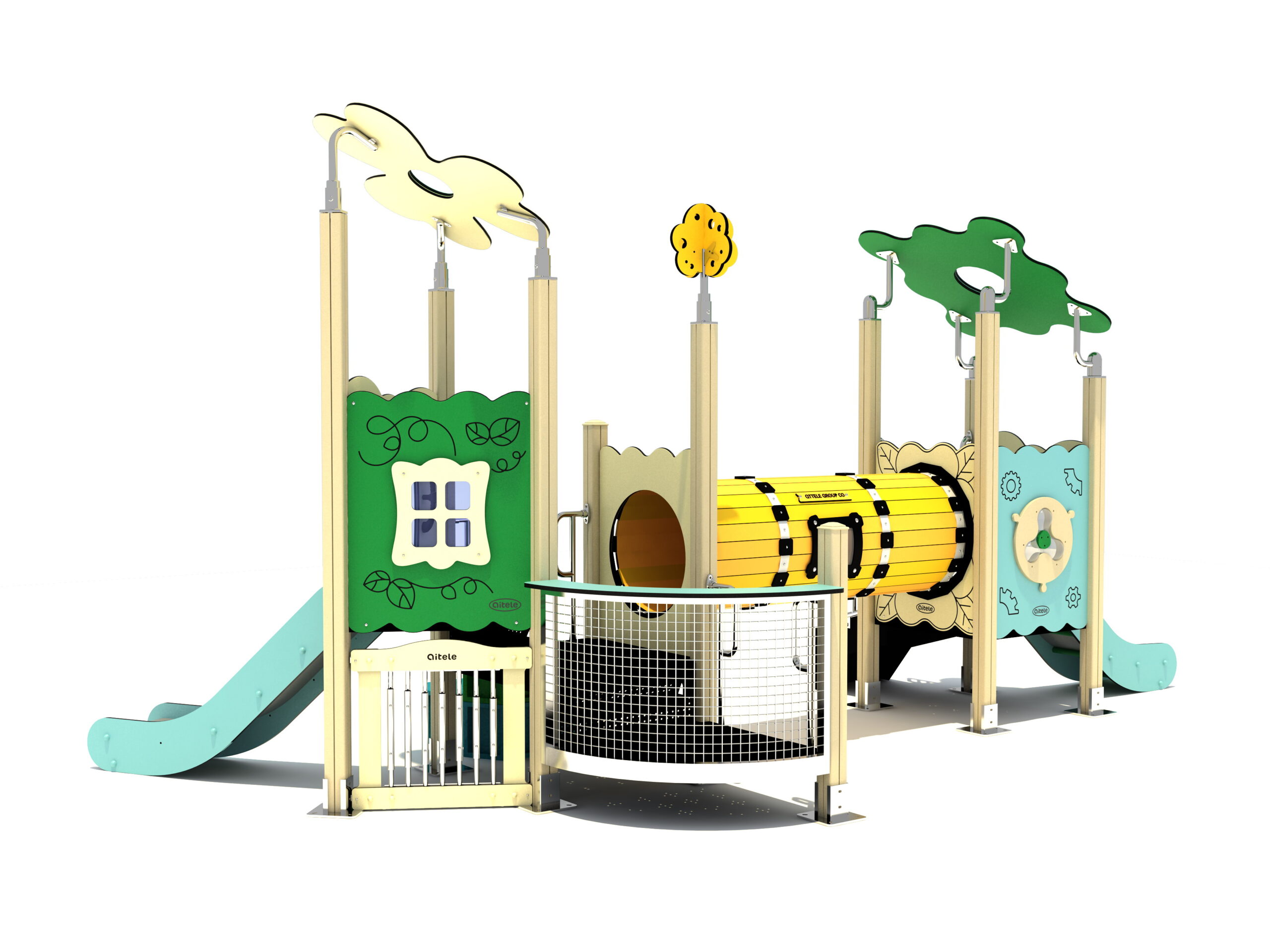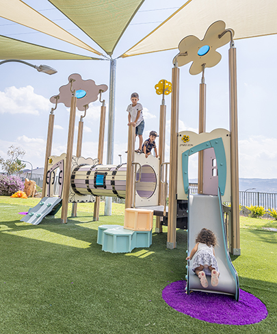 מתקן משולב לפעוטות בעל שתי מגלשות, ביניהן מנהרת זחילה