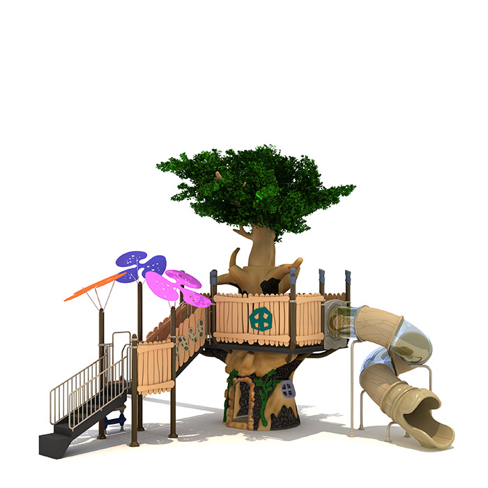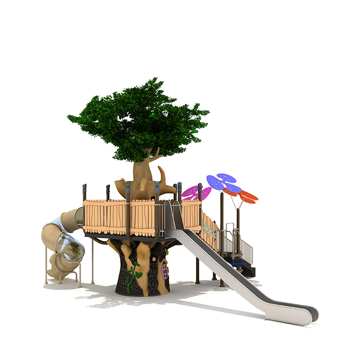 מתקן בצורת עץ גבוה וקסום, עם מרפסת, מגלשות ומחבוא בתוך גזע העץ.