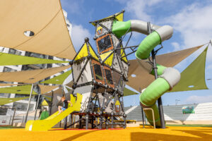 מתקן משולב בצורת ביתן בעל מגלשה מגובה 1.20 מ’